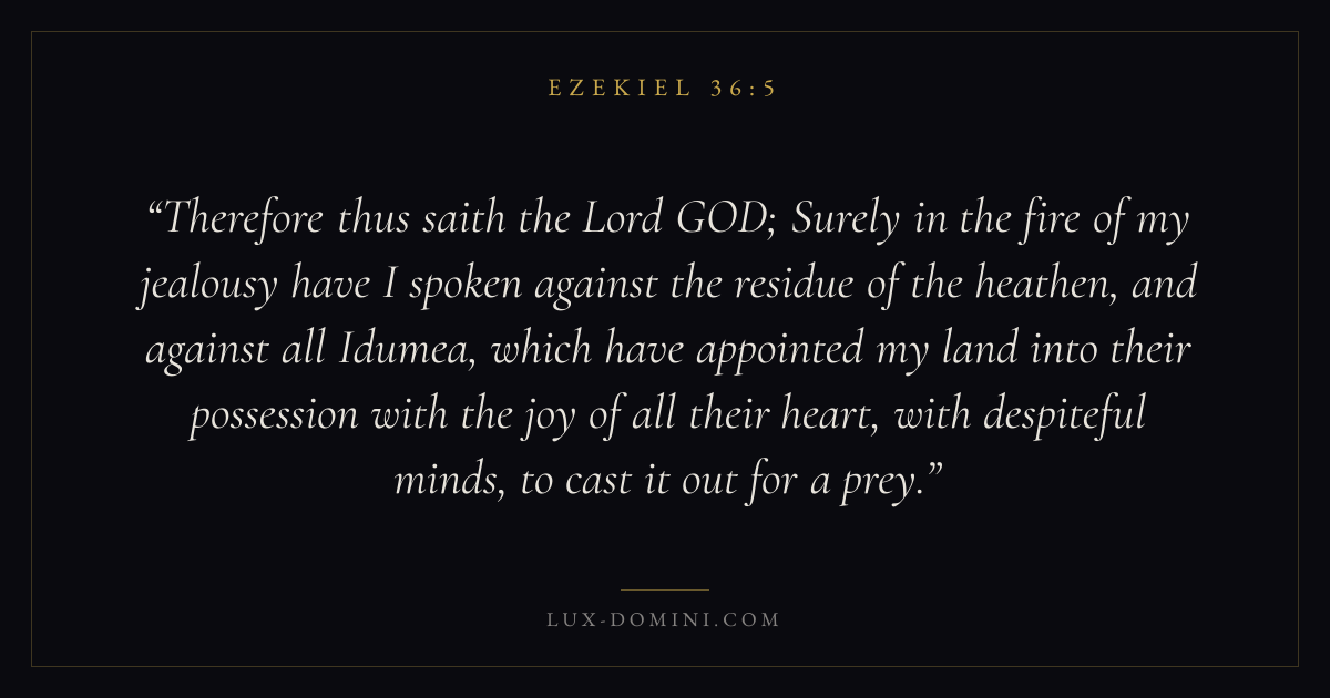 Therefore thus saith the Lord GOD; Surely in the fire of my jealousy have I spoken against the residue of the heathen, and against all Idumea, which have appointed my land into their possession with the joy of all their heart, with despiteful minds, to cast it out for a prey.