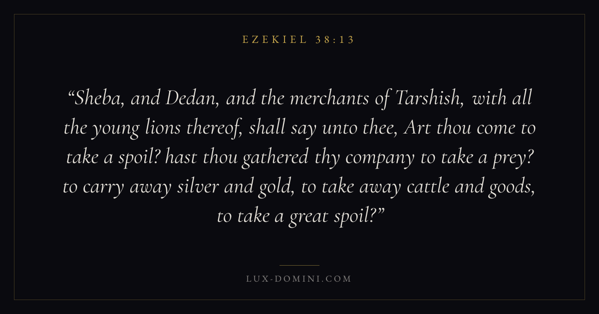 Sheba, and Dedan, and the merchants of Tarshish, with all the young lions thereof, shall say unto thee, Art thou come to take a spoil? hast thou gathered thy company to take a prey? to carry away silver and gold, to take away cattle and goods, to take a great spoil?