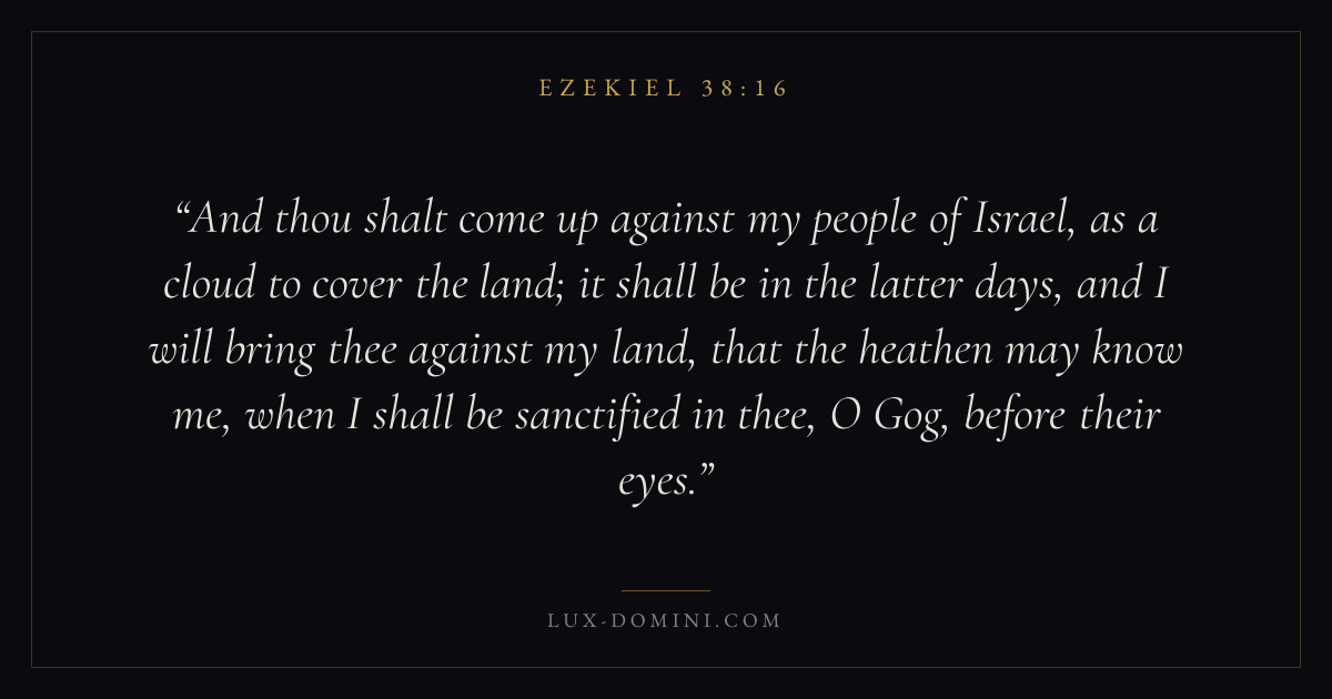 And thou shalt come up against my people of Israel, as a cloud to cover the land; it shall be in the latter days, and I will bring thee against my land, that the heathen may know me, when I shall be sanctified in thee, O Gog, before their eyes.