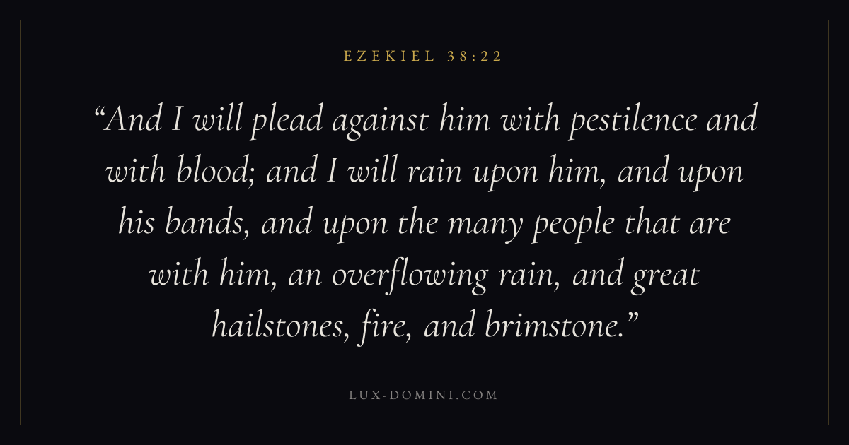 And I will plead against him with pestilence and with blood; and I will rain upon him, and upon his bands, and upon the many people that are with him, an overflowing rain, and great hailstones, fire, and brimstone.