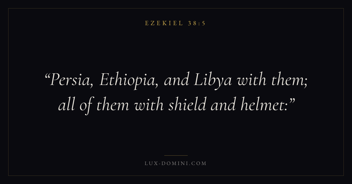 Books / Ezekiel / Chapter 38 / Verse 5 ← Ezekiel 38:4 Ezekiel 38:5 Ezekiel 38:6 → Persia, Ethiopia, and Libya with them; all of them with shield and helmet: Download verse card Share on Twitter Share on Facebook Pin it ✦ Key themes Justice and mercyGlory of GodJudgmentExile Read with Ezekiel 38:1Ezekiel 38:2Micah 6:8Amos 5:24 Related topics Bible verses about justice and mercy Glossary Cush Place Country of burnt faces; the Greek word by which the Hebrew Cush is rendered. Modern identification: Meroe. Persia Place Biblical region. Modern identification: Tell Hagmatana. Put Place Biblical region. Modern identification: Cyrene. ✦ Ezekiel Chapter 38 verses V. 1 V. 2 V. 3 V. 4 V. 5 V. 6 V. 7 V. 8 V. 9 V. 10 V. 11 V. 12 V. 13 V. 14 V. 15 V. 16 V. 17 V. 18 V. 19 V. 20 V. 21 V. 22 V. 23