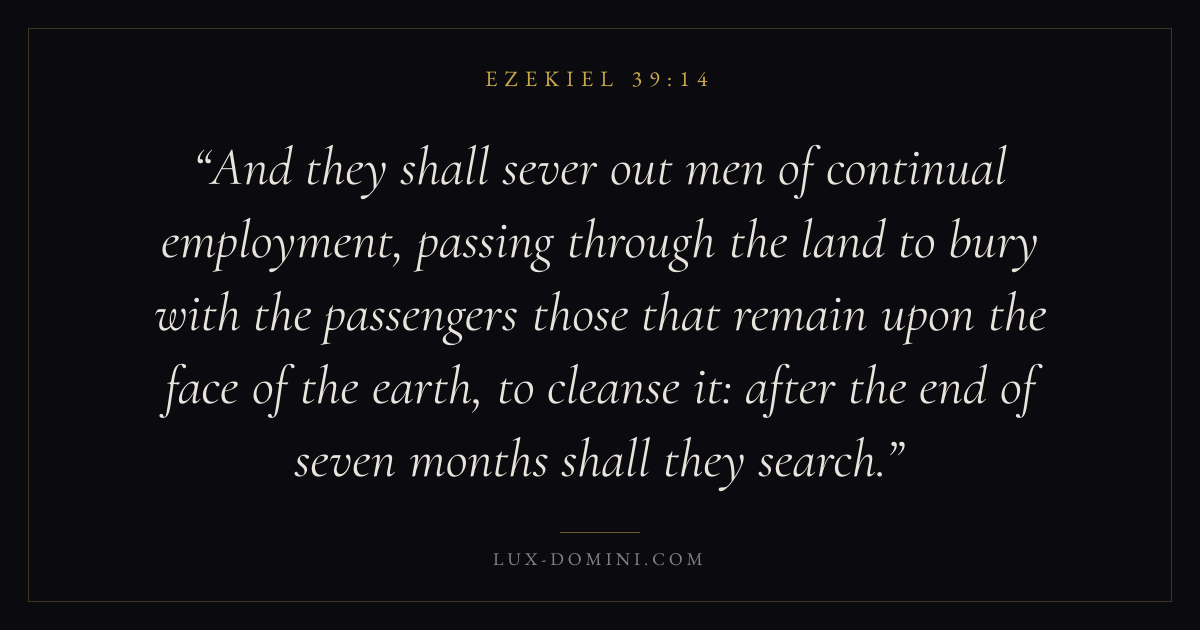 And they shall sever out men of continual employment, passing through the land to bury with the passengers those that remain upon the face of the earth, to cleanse it: after the end of seven months shall they search.