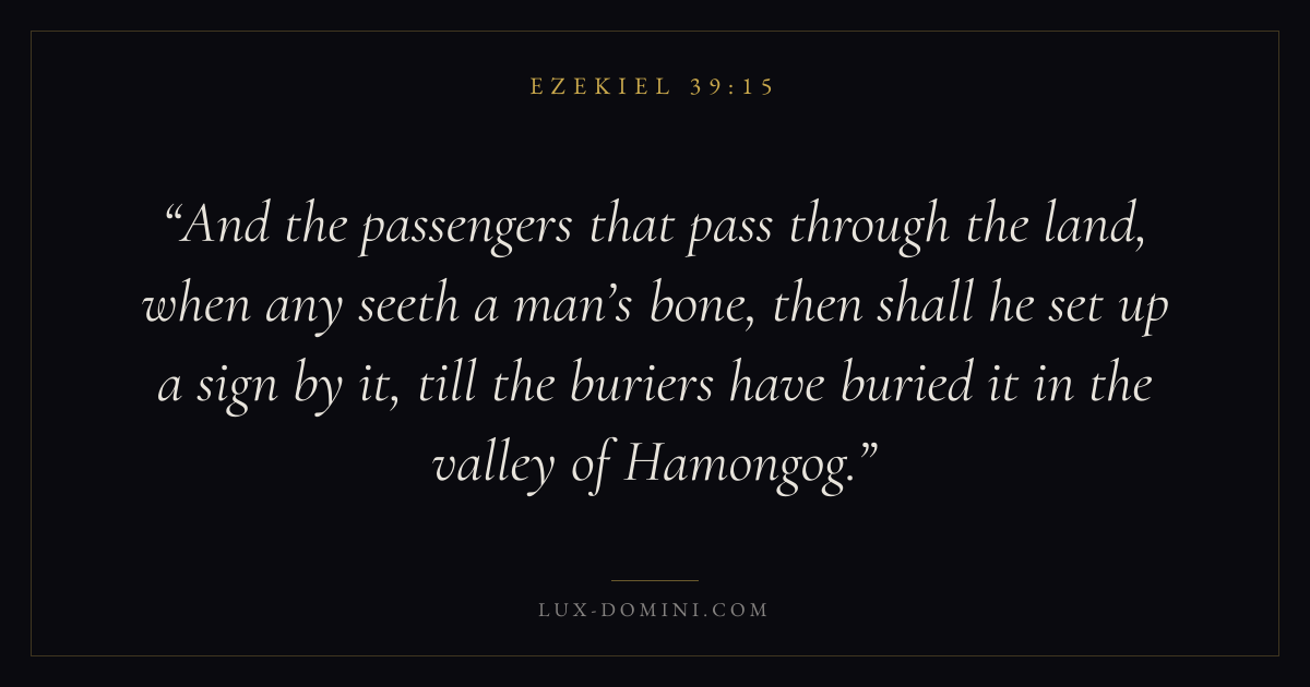 And the passengers that pass through the land, when any seeth a man’s bone, then shall he set up a sign by it, till the buriers have buried it in the valley of Hamongog.