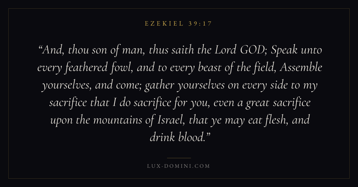 And, thou son of man, thus saith the Lord GOD; Speak unto every feathered fowl, and to every beast of the field, Assemble yourselves, and come; gather yourselves on every side to my sacrifice that I do sacrifice for you, even a great sacrifice upon the mountains of Israel, that ye may eat flesh, and drink blood.