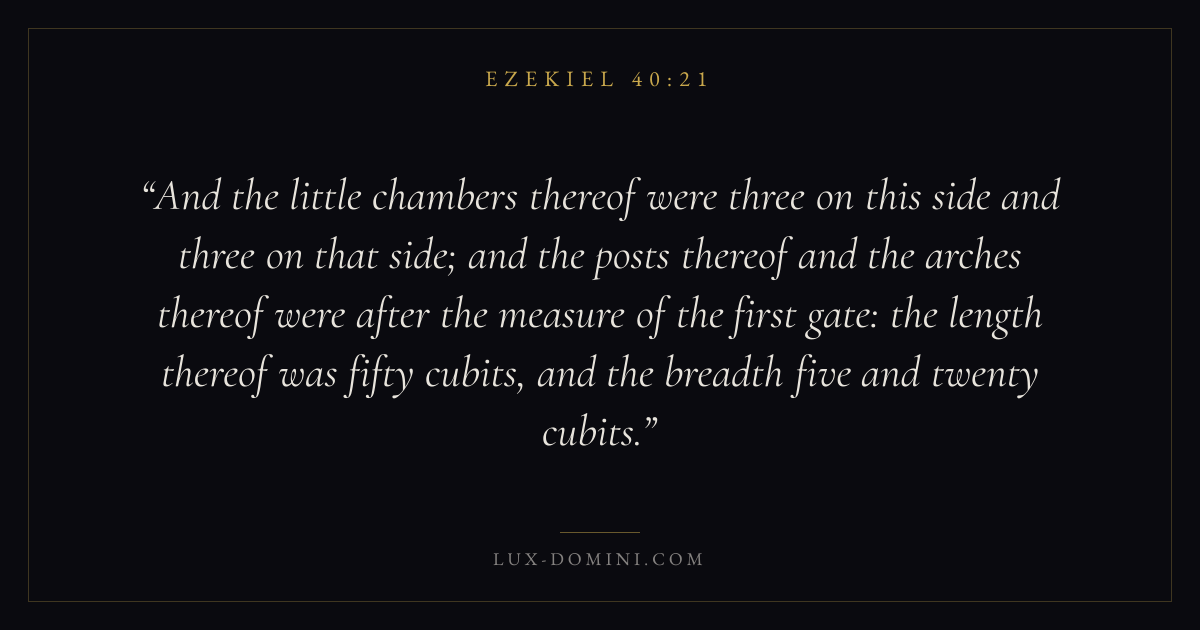 And the little chambers thereof were three on this side and three on that side; and the posts thereof and the arches thereof were after the measure of the first gate: the length thereof was fifty cubits, and the breadth five and twenty cubits.