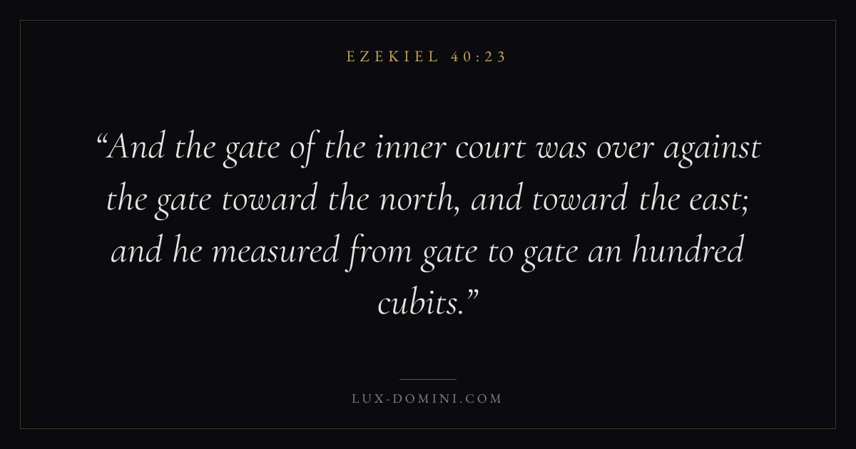 And the gate of the inner court was over against the gate toward the north, and toward the east; and he measured from gate to gate an hundred cubits.