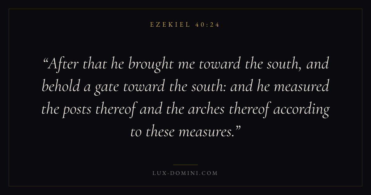 After that he brought me toward the south, and behold a gate toward the south: and he measured the posts thereof and the arches thereof according to these measures.