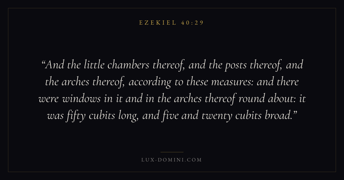 And the little chambers thereof, and the posts thereof, and the arches thereof, according to these measures: and there were windows in it and in the arches thereof round about: it was fifty cubits long, and five and twenty cubits broad.
