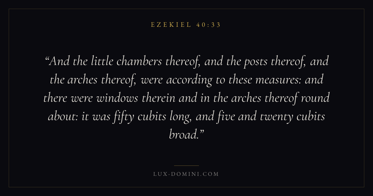 And the little chambers thereof, and the posts thereof, and the arches thereof, were according to these measures: and there were windows therein and in the arches thereof round about: it was fifty cubits long, and five and twenty cubits broad.