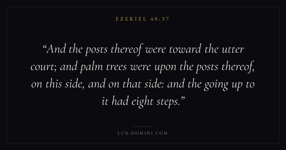 And the posts thereof were toward the utter court; and palm trees were upon the posts thereof, on this side, and on that side: and the going up to it had eight steps.