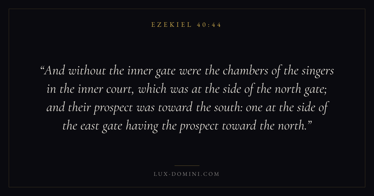 And without the inner gate were the chambers of the singers in the inner court, which was at the side of the north gate; and their prospect was toward the south: one at the side of the east gate having the prospect toward the north.
