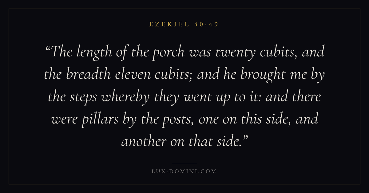 The length of the porch was twenty cubits, and the breadth eleven cubits; and he brought me by the steps whereby they went up to it: and there were pillars by the posts, one on this side, and another on that side.