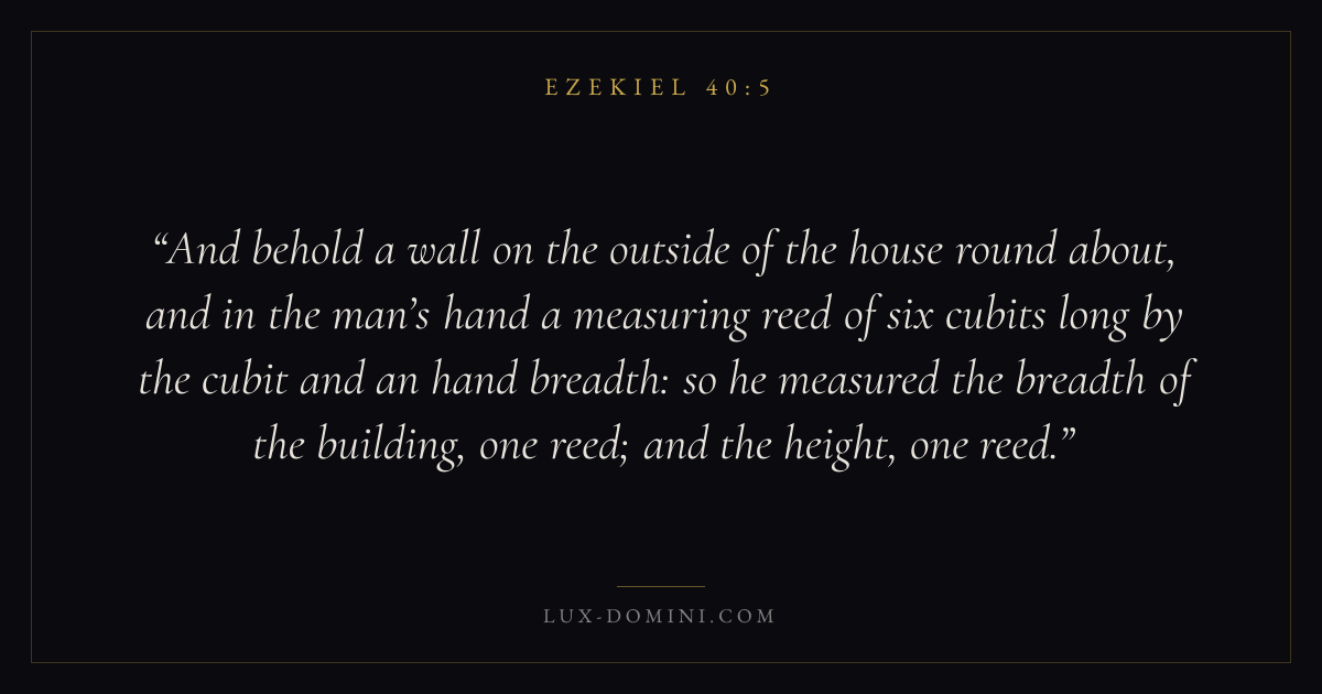 And behold a wall on the outside of the house round about, and in the man’s hand a measuring reed of six cubits long by the cubit and an hand breadth: so he measured the breadth of the building, one reed; and the height, one reed.