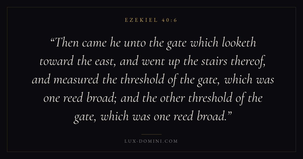 Then came he unto the gate which looketh toward the east, and went up the stairs thereof, and measured the threshold of the gate, which was one reed broad; and the other threshold of the gate, which was one reed broad.