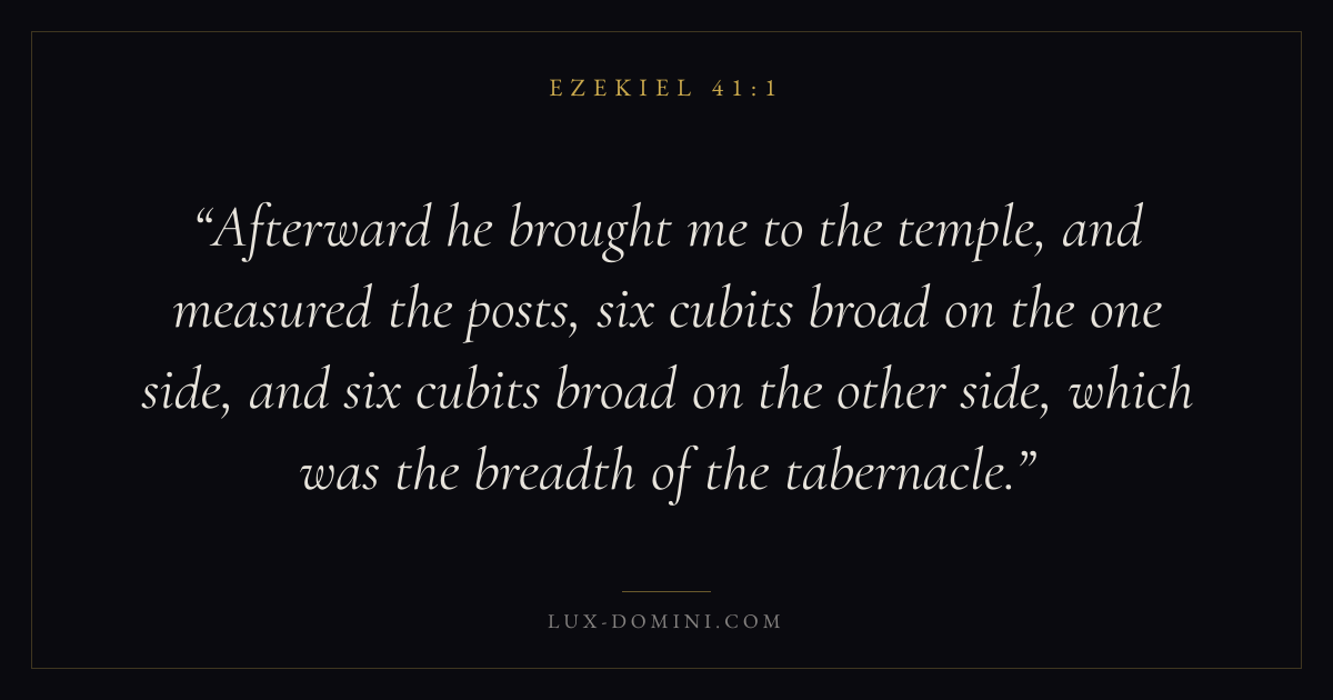 Afterward he brought me to the temple, and measured the posts, six cubits broad on the one side, and six cubits broad on the other side, which was the breadth of the tabernacle.