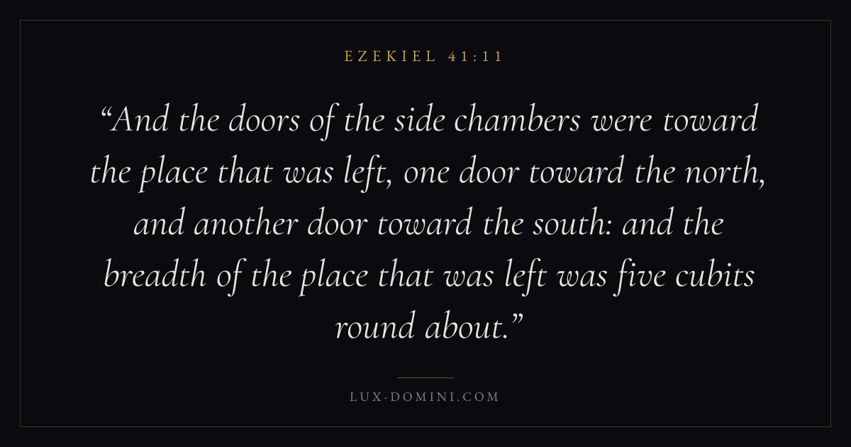 And the doors of the side chambers were toward the place that was left, one door toward the north, and another door toward the south: and the breadth of the place that was left was five cubits round about.