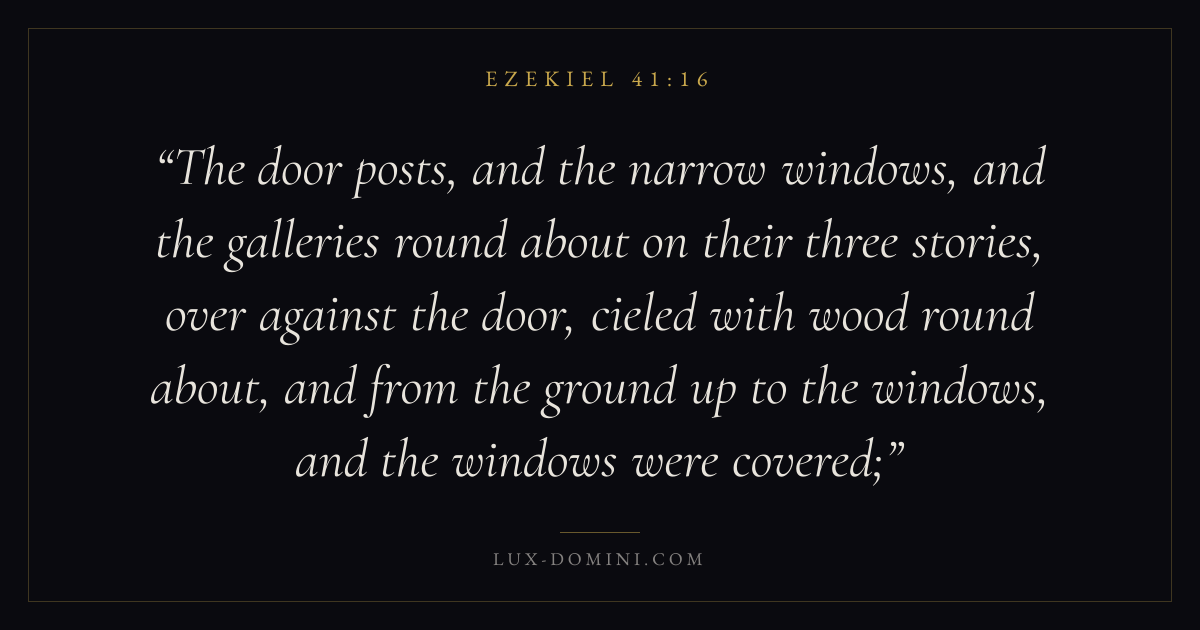 The door posts, and the narrow windows, and the galleries round about on their three stories, over against the door, cieled with wood round about, and from the ground up to the windows, and the windows were covered;