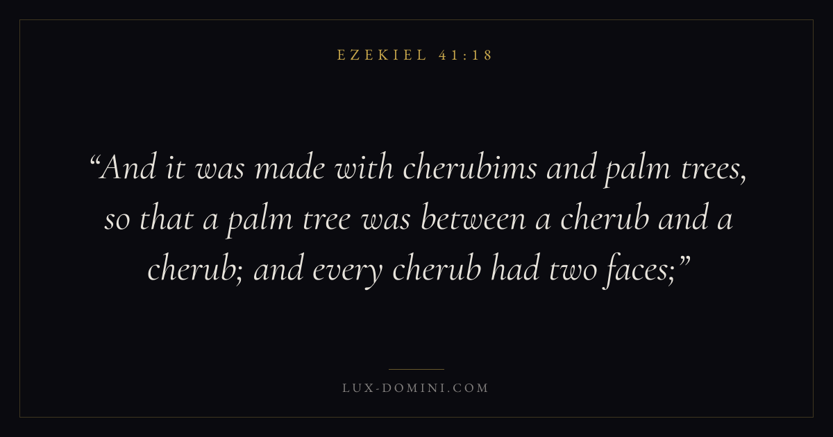 And it was made with cherubims and palm trees, so that a palm tree was between a cherub and a cherub; and every cherub had two faces;