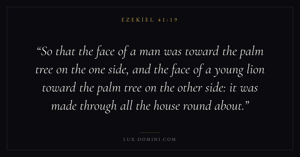 So that the face of a man was toward the palm tree on the one side, and the face of a young lion toward the palm tree on the other side: it was made through all the house round about.