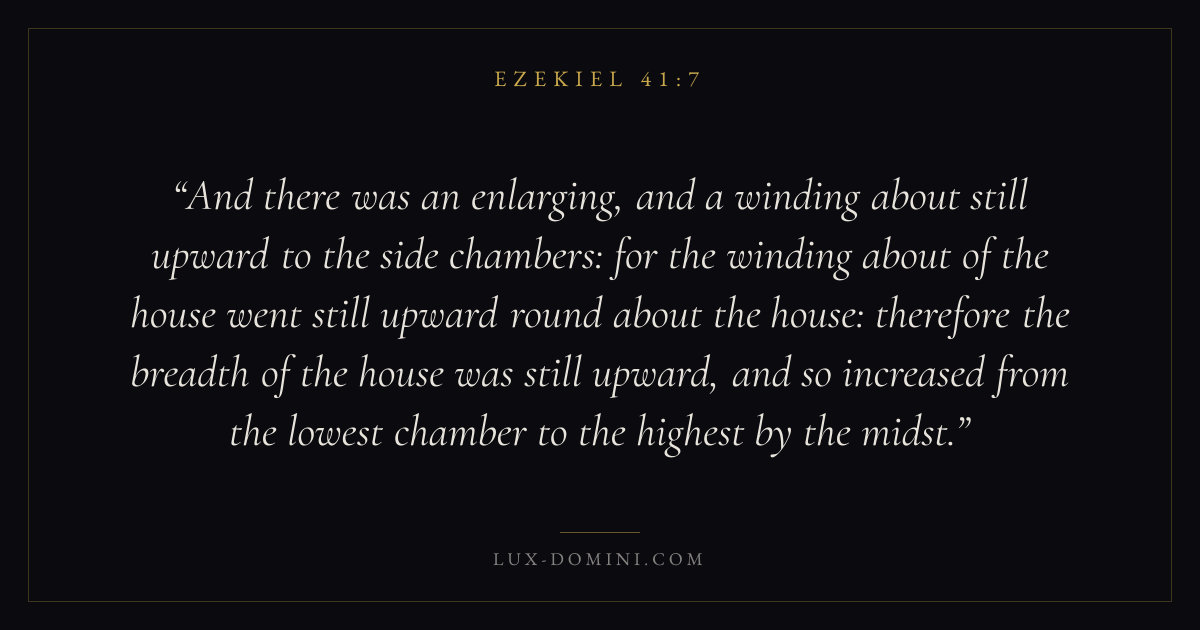 And there was an enlarging, and a winding about still upward to the side chambers: for the winding about of the house went still upward round about the house: therefore the breadth of the house was still upward, and so increased from the lowest chamber to the highest by the midst.