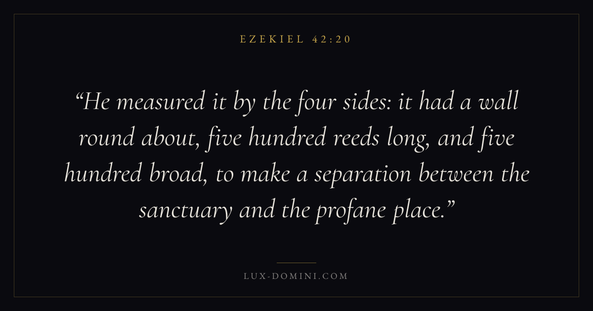 He measured it by the four sides: it had a wall round about, five hundred reeds long, and five hundred broad, to make a separation between the sanctuary and the profane place.