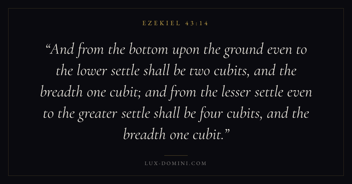 And from the bottom upon the ground even to the lower settle shall be two cubits, and the breadth one cubit; and from the lesser settle even to the greater settle shall be four cubits, and the breadth one cubit.
