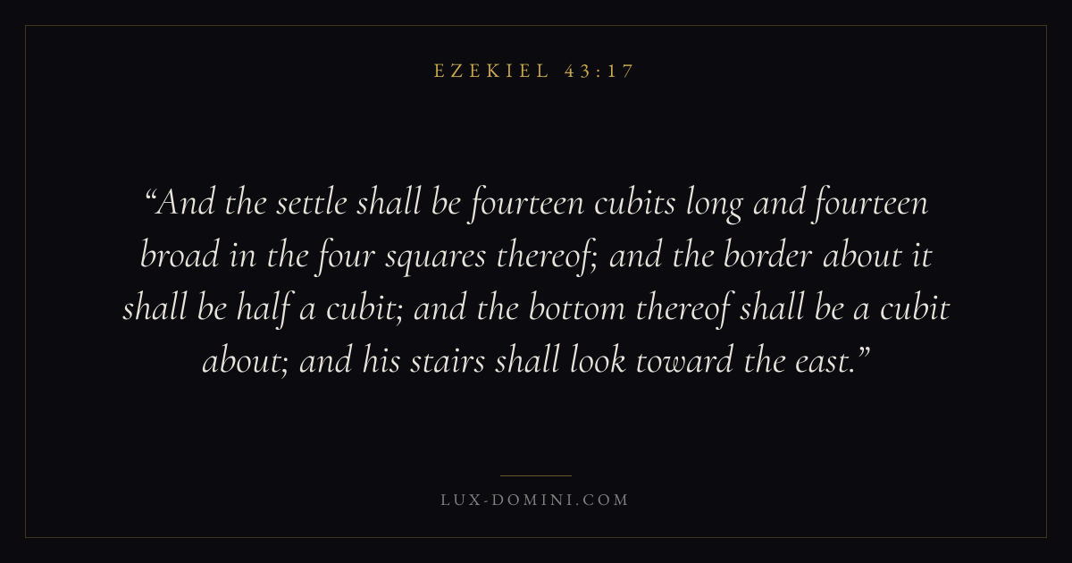 And the settle shall be fourteen cubits long and fourteen broad in the four squares thereof; and the border about it shall be half a cubit; and the bottom thereof shall be a cubit about; and his stairs shall look toward the east.