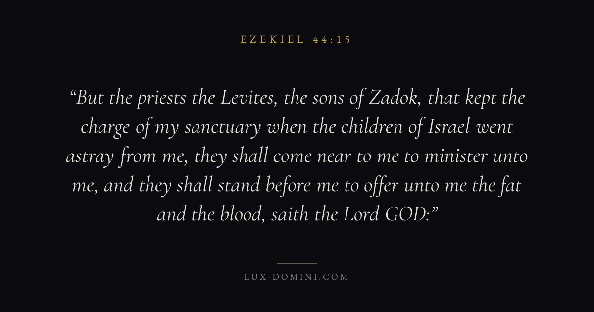 But the priests the Levites, the sons of Zadok, that kept the charge of my sanctuary when the children of Israel went astray from me, they shall come near to me to minister unto me, and they shall stand before me to offer unto me the fat and the blood, saith the Lord GOD:
