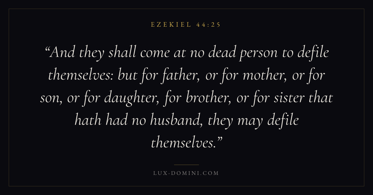 And they shall come at no dead person to defile themselves: but for father, or for mother, or for son, or for daughter, for brother, or for sister that hath had no husband, they may defile themselves.