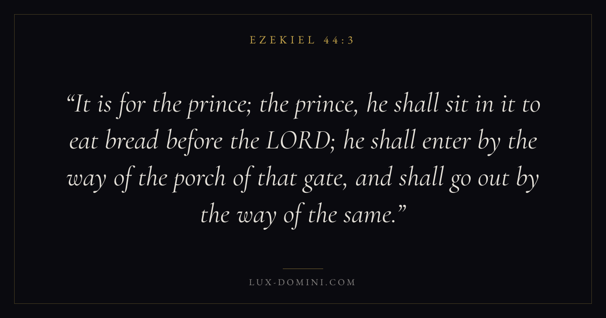 It is for the prince; the prince, he shall sit in it to eat bread before the LORD; he shall enter by the way of the porch of that gate, and shall go out by the way of the same.