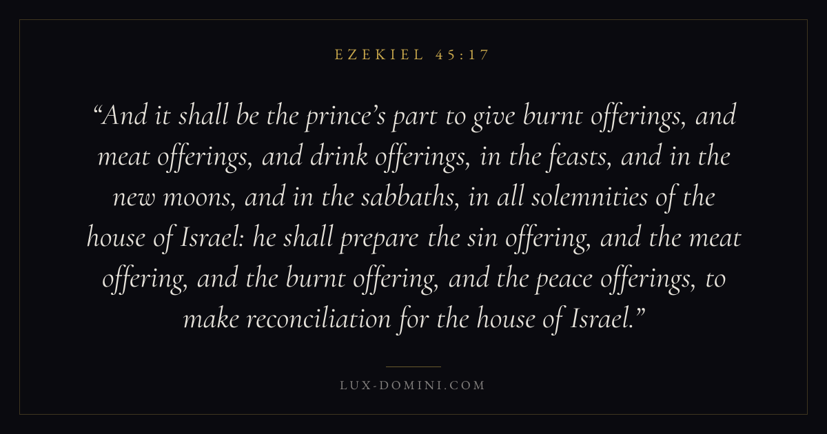 And it shall be the prince’s part to give burnt offerings, and meat offerings, and drink offerings, in the feasts, and in the new moons, and in the sabbaths, in all solemnities of the house of Israel: he shall prepare the sin offering, and the meat offering, and the burnt offering, and the peace offerings, to make reconciliation for the house of Israel.