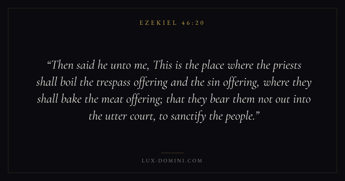 Then said he unto me, This is the place where the priests shall boil the trespass offering and the sin offering, where they shall bake the meat offering; that they bear them not out into the utter court, to sanctify the people.