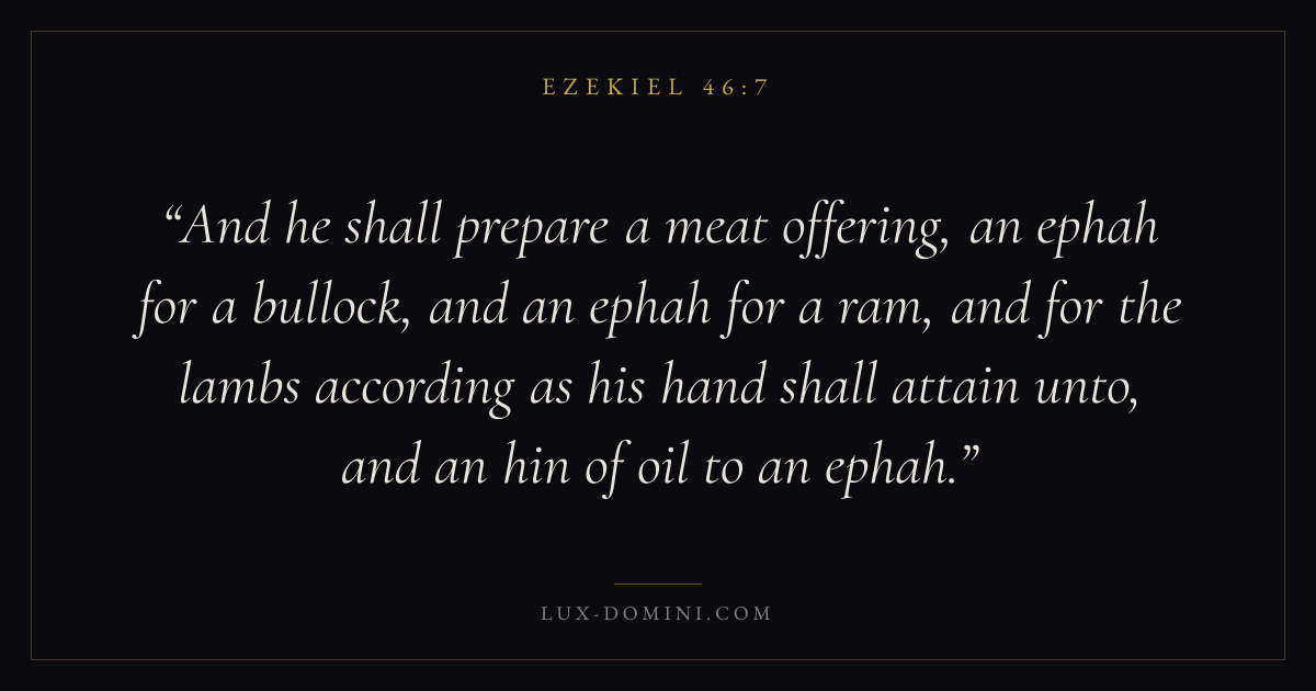 And he shall prepare a meat offering, an ephah for a bullock, and an ephah for a ram, and for the lambs according as his hand shall attain unto, and an hin of oil to an ephah.