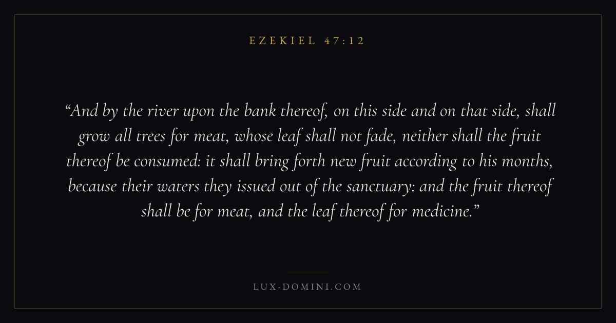 And by the river upon the bank thereof, on this side and on that side, shall grow all trees for meat, whose leaf shall not fade, neither shall the fruit thereof be consumed: it shall bring forth new fruit according to his months, because their waters they issued out of the sanctuary: and the fruit thereof shall be for meat, and the leaf thereof for medicine.