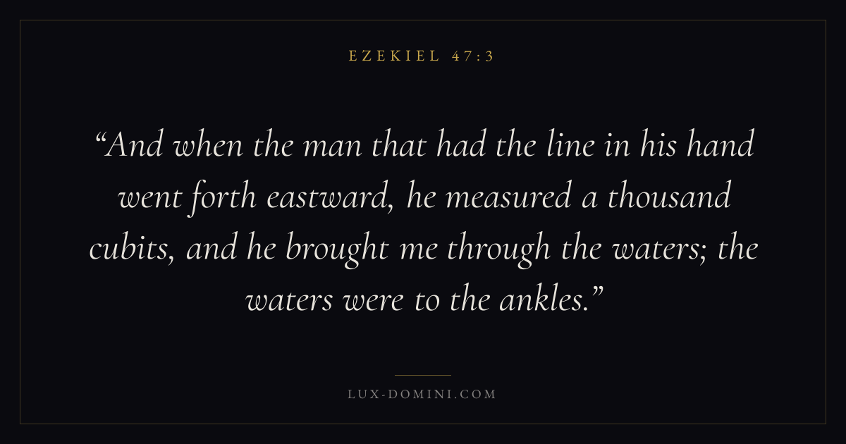 And when the man that had the line in his hand went forth eastward, he measured a thousand cubits, and he brought me through the waters; the waters were to the ankles.