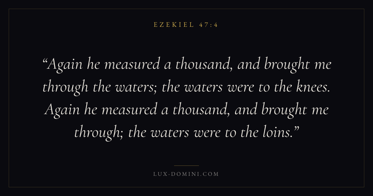 Again he measured a thousand, and brought me through the waters; the waters were to the knees. Again he measured a thousand, and brought me through; the waters were to the loins.
