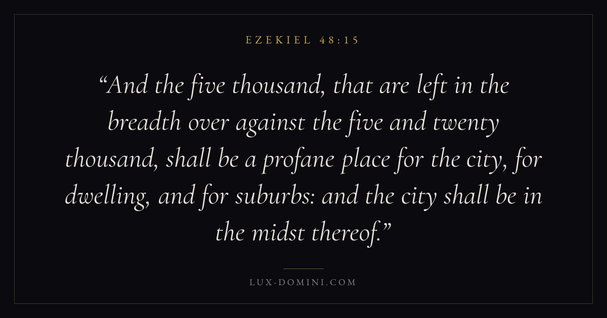 And the five thousand, that are left in the breadth over against the five and twenty thousand, shall be a profane place for the city, for dwelling, and for suburbs: and the city shall be in the midst thereof.