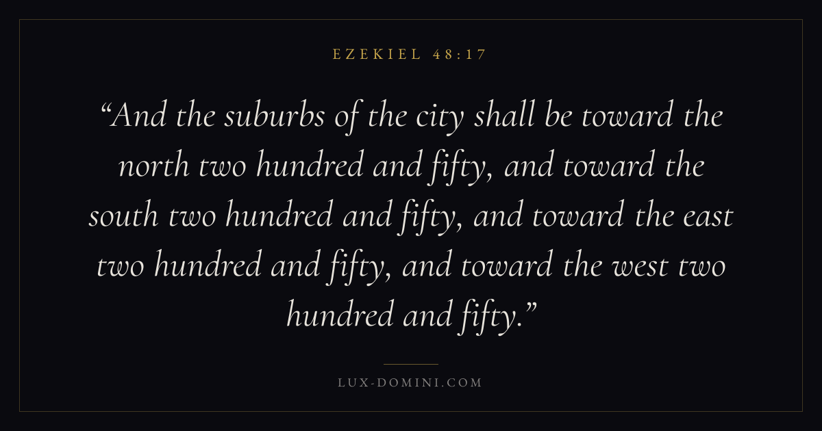 And the suburbs of the city shall be toward the north two hundred and fifty, and toward the south two hundred and fifty, and toward the east two hundred and fifty, and toward the west two hundred and fifty.