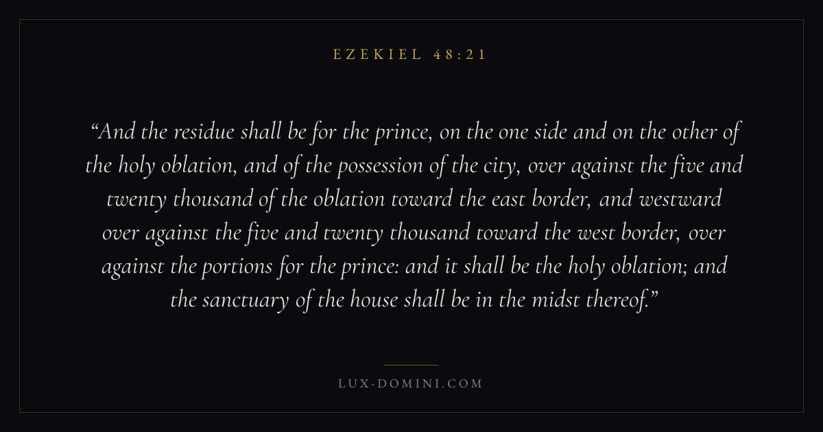 And the residue shall be for the prince, on the one side and on the other of the holy oblation, and of the possession of the city, over against the five and twenty thousand of the oblation toward the east border, and westward over against the five and twenty thousand toward the west border, over against the portions for the prince: and it shall be the holy oblation; and the sanctuary of the house shall be in the midst thereof.