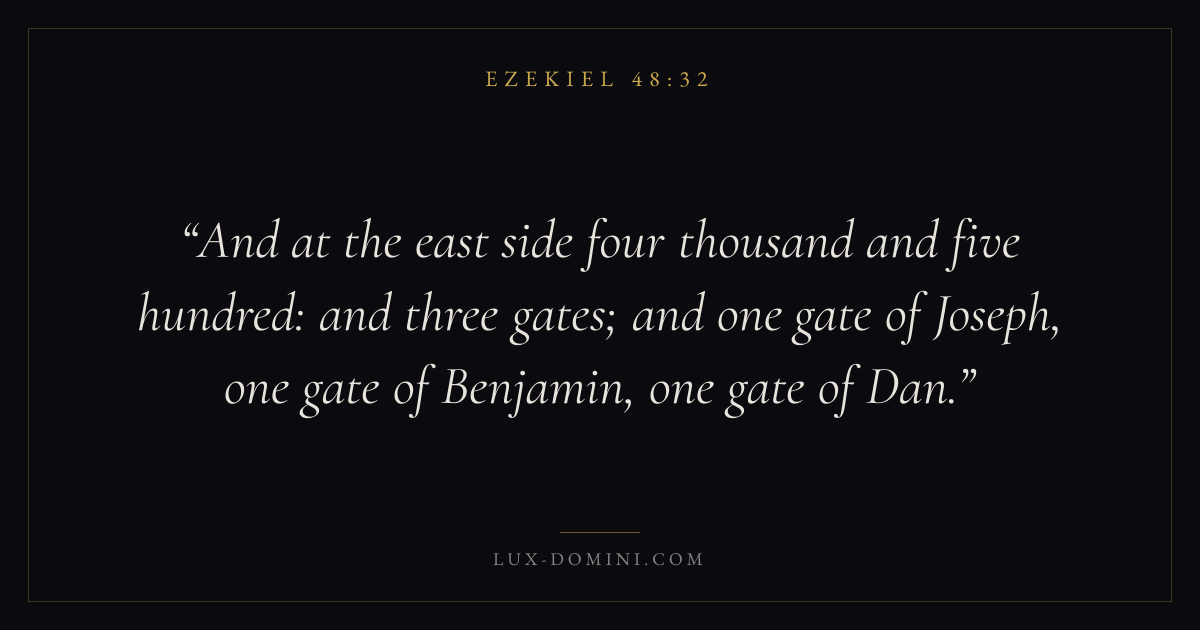 And at the east side four thousand and five hundred: and three gates; and one gate of Joseph, one gate of Benjamin, one gate of Dan.