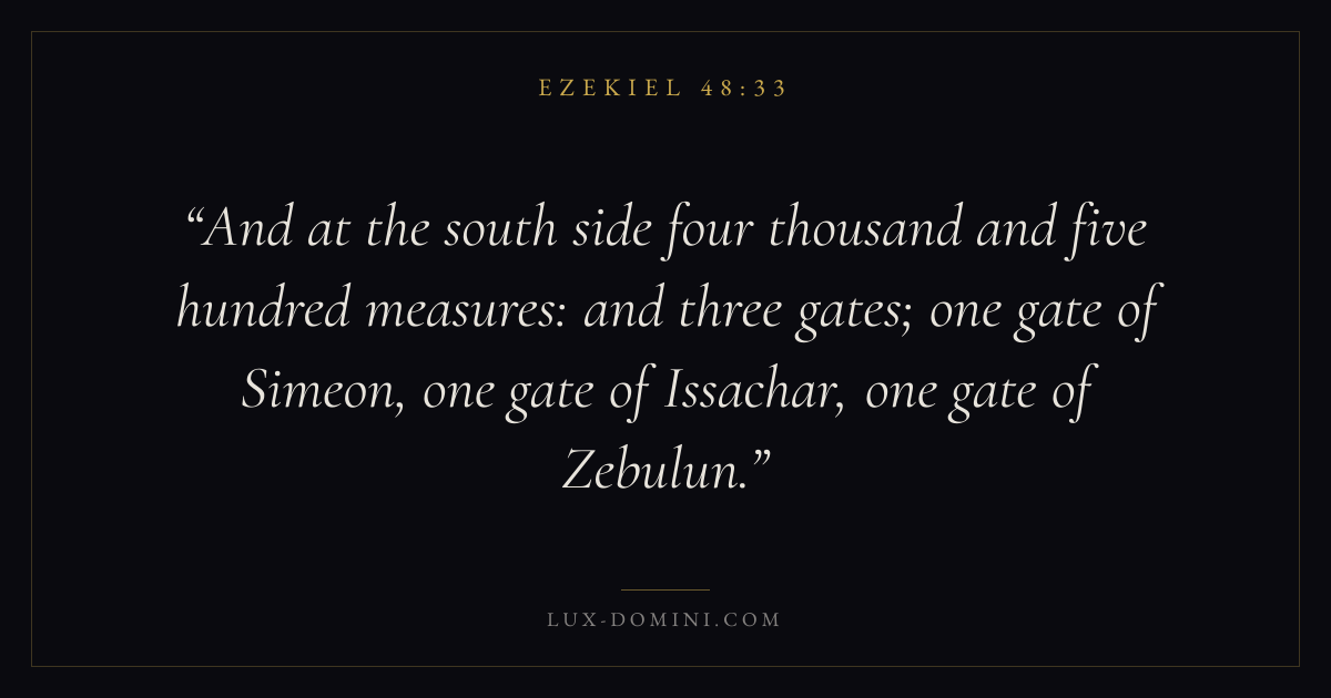 And at the south side four thousand and five hundred measures: and three gates; one gate of Simeon, one gate of Issachar, one gate of Zebulun.