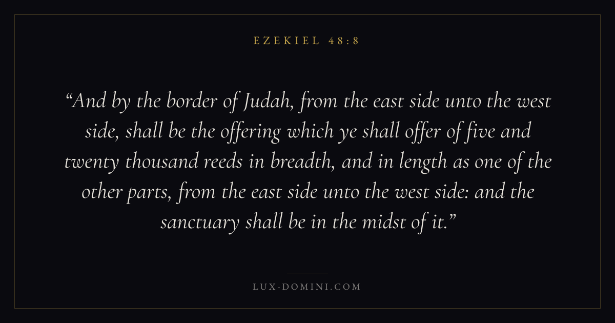 And by the border of Judah, from the east side unto the west side, shall be the offering which ye shall offer of five and twenty thousand reeds in breadth, and in length as one of the other parts, from the east side unto the west side: and the sanctuary shall be in the midst of it.