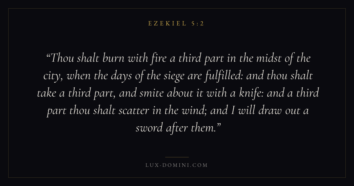 Thou shalt burn with fire a third part in the midst of the city, when the days of the siege are fulfilled: and thou shalt take a third part, and smite about it with a knife: and a third part thou shalt scatter in the wind; and I will draw out a sword after them.