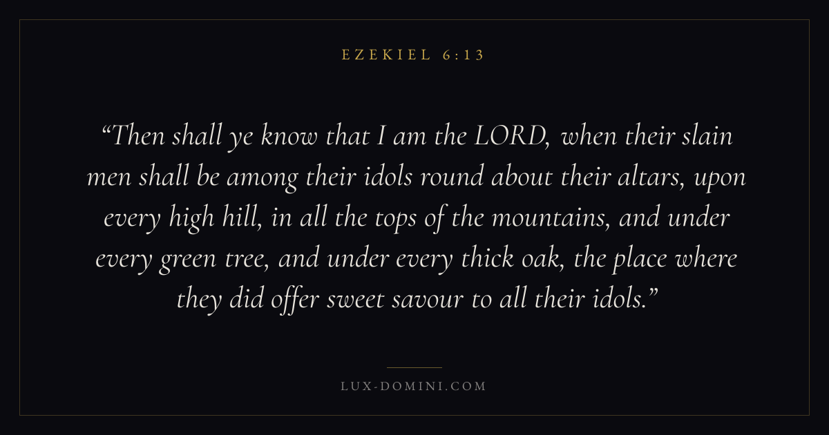 Then shall ye know that I am the LORD, when their slain men shall be among their idols round about their altars, upon every high hill, in all the tops of the mountains, and under every green tree, and under every thick oak, the place where they did offer sweet savour to all their idols.