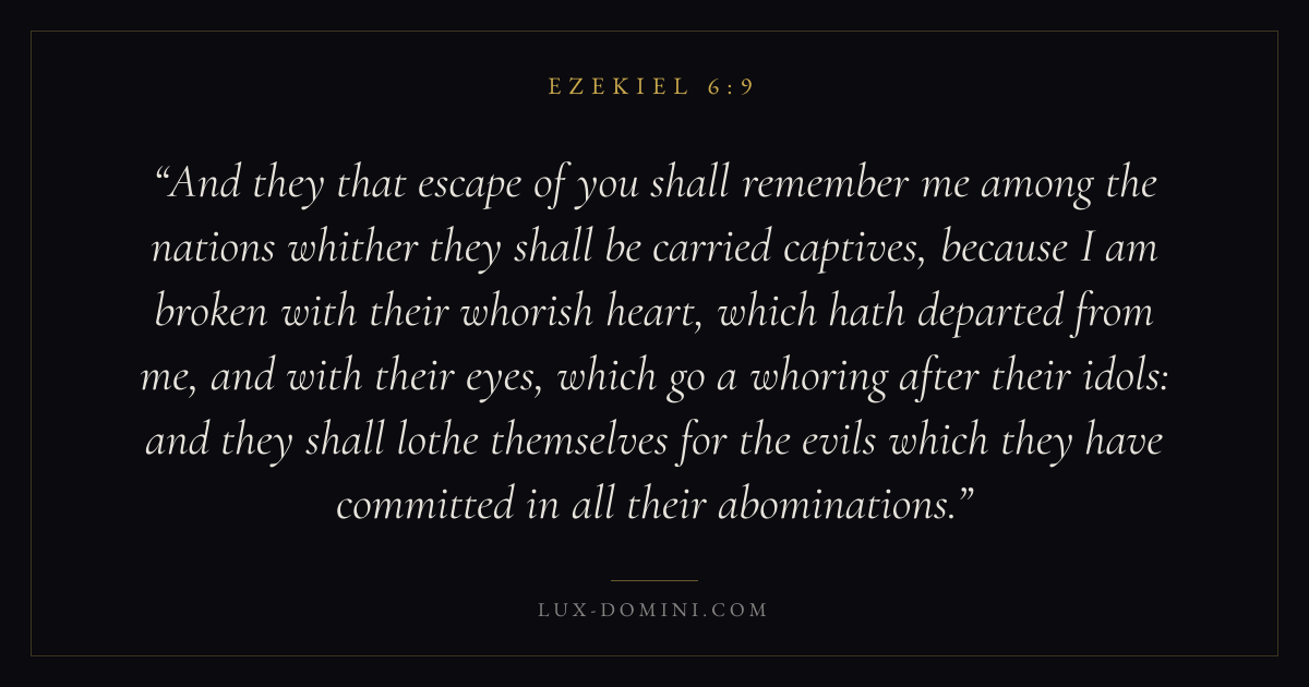 And they that escape of you shall remember me among the nations whither they shall be carried captives, because I am broken with their whorish heart, which hath departed from me, and with their eyes, which go a whoring after their idols: and they shall lothe themselves for the evils which they have committed in all their abominations.