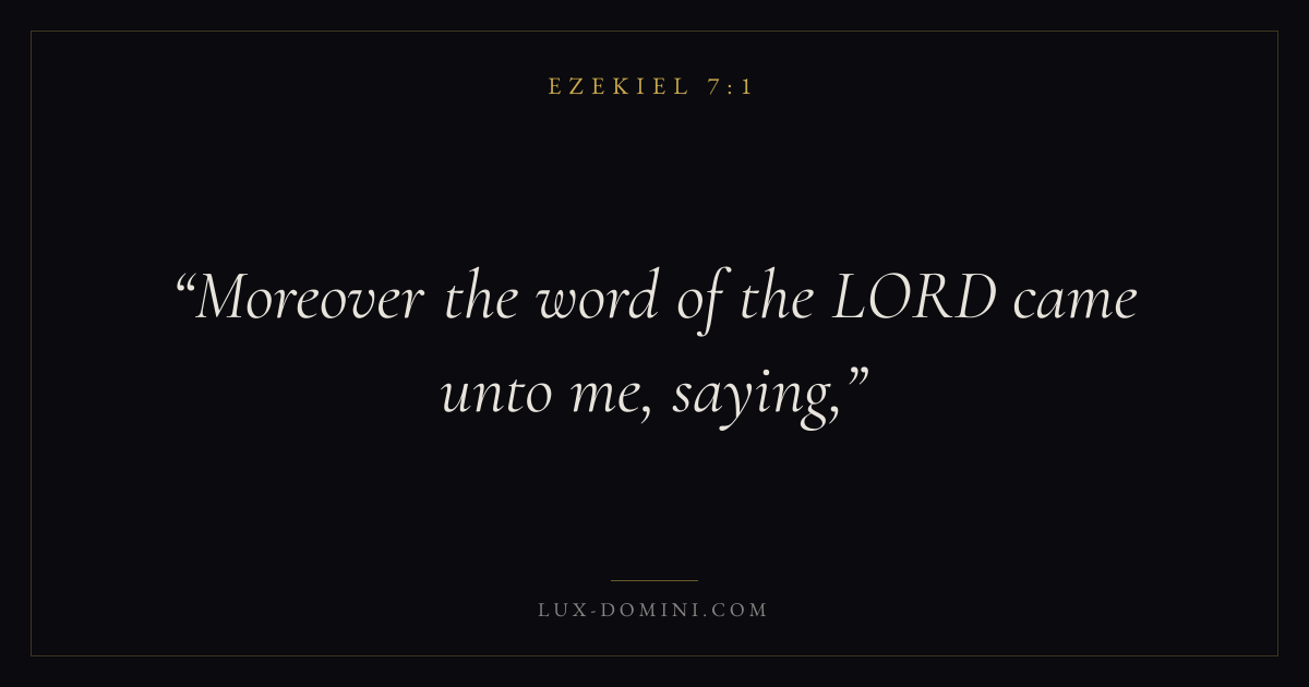 Books / Ezekiel / Chapter 7 / Verse 1 ← Ezekiel 6:14 Ezekiel 7:1 Ezekiel 7:2 → Moreover the word of the LORD came unto me, saying, Download verse card Share on Twitter Share on Facebook Pin it ✦ Key themes Justice and mercyTruthGlory of GodJudgment Read with Ezekiel 7:2Ezekiel 7:3Micah 6:8Amos 5:24 Related topics Bible verses about justice and mercyBible verses about truth ✦ Ezekiel Chapter 7 verses V. 1 V. 2 V. 3 V. 4 V. 5 V. 6 V. 7 V. 8 V. 9 V. 10 V. 11 V. 12 V. 13 V. 14 V. 15 V. 16 V. 17 V. 18 V. 19 V. 20 V. 21 V. 22 V. 23 V. 24 V. 25 V. 26 V. 27