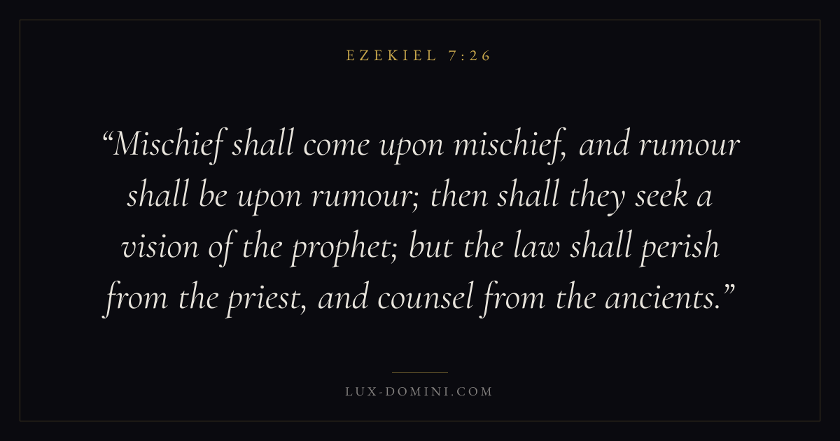 Mischief shall come upon mischief, and rumour shall be upon rumour; then shall they seek a vision of the prophet; but the law shall perish from the priest, and counsel from the ancients.