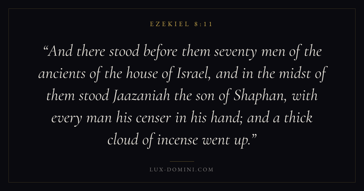 And there stood before them seventy men of the ancients of the house of Israel, and in the midst of them stood Jaazaniah the son of Shaphan, with every man his censer in his hand; and a thick cloud of incense went up.