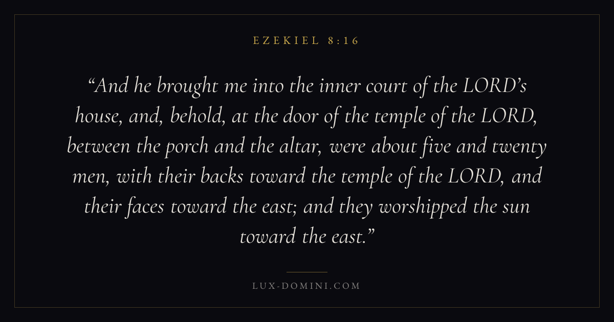 And he brought me into the inner court of the LORD’s house, and, behold, at the door of the temple of the LORD, between the porch and the altar, were about five and twenty men, with their backs toward the temple of the LORD, and their faces toward the east; and they worshipped the sun toward the east.
