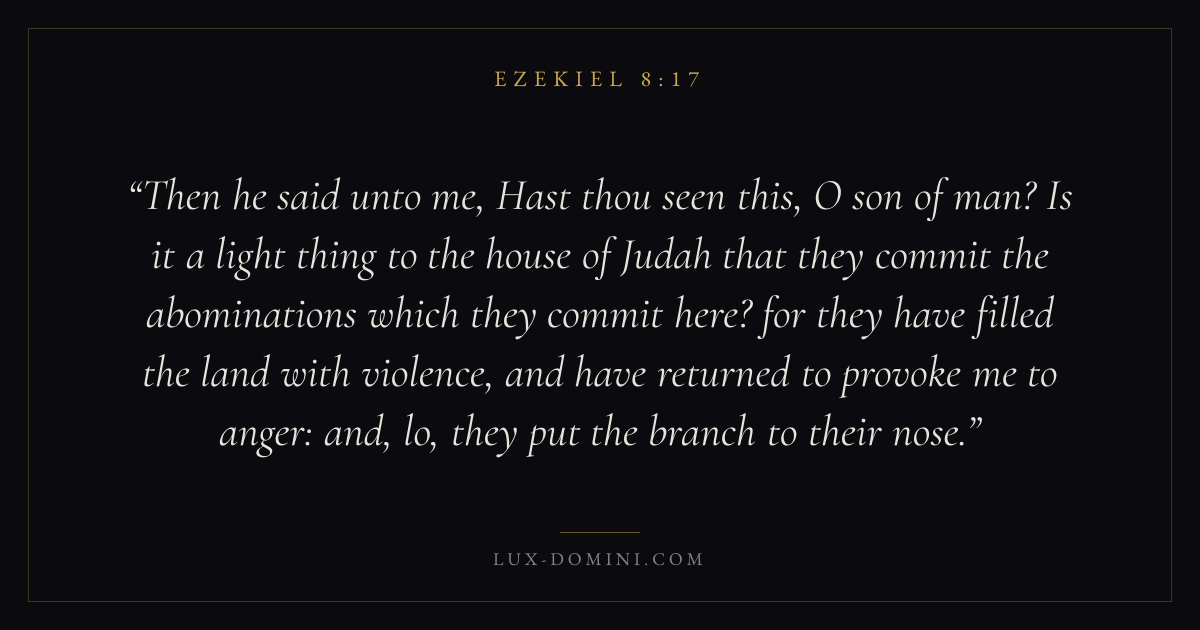 Then he said unto me, Hast thou seen this, O son of man? Is it a light thing to the house of Judah that they commit the abominations which they commit here? for they have filled the land with violence, and have returned to provoke me to anger: and, lo, they put the branch to their nose.